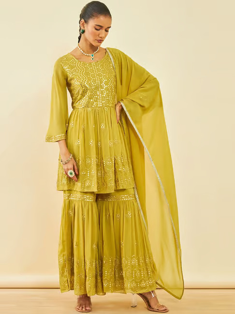From pre-stitched sarees and fusion co-ords to embellished kurtas and breezy shararas, TATA CLiQ Fashion brings together a curated collection of Haldi-perfect looks. Whether you’re the bride glowing in mustard or the bestie planning a group twinning moment – we’ve got the fits that’ll turn every photo into a Pinterest board.